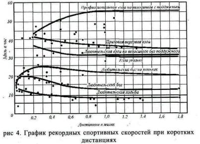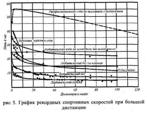 Известно, что все эти рекордсмены напрягли усилия до последней степени; предполагая, что они приблизительно равны друг другу по силе, выдержке и уменью, мы убеждаемся, что, встав на коньки, мы тем самым, не повышая усилия, увеличиваем скорость при одной миле в 2,37 раза, а при ста милях в 2,92 раза, что замена коньков велосипедом увеличивает быстроту при одной миле в 3,4 раза, а при ста милях в 4,2 раза и что, наконец, прибавив поддужного, который ничем не помогает велосипедисту, а только прикрывает его от ветра, мы увеличиваем скорость по сравнению с пешей ходьбой в шесть раз при дистанции в одну милю и в 7,4 раза при дистанции в 100 миль. Конечно, все эти цифры относятся к ненормальной, к исключительной, действительно рекордной скорости, но кто же может сомневаться, что отношения останутся неизменными и в том случае, если мы эту скорость уменьшим вдвое, т.е. сведем ее к нормальным 4,6 мили в час при ходьбе и 28 милям в час при велосипедной езде с поддужным? Быть может, настанет время, когда наши аэропланы, поднимаясь подобно птицам на воздушной струе и скользя подобно им по воздушным течениям, будут делать тысячи миль со скоростью двух миль в минуту, т.е. двигаться в двадцать раз быстрее пешехода, причем летчик не будет затрачивать никаких мускульных усилий. Чтобы учитывать ветер, он будет пользоваться точными инструментами, чтобы управлять аппаратом, он будет работать головой. Но таблица и графики указывают нам и на другие факты. При дистанции в 100 миль скорость во всех случаях оказывается ниже, чем при дистанции в одну милю, у конькобежца и велосипедиста она падает всего до 64%, а у пешеходов и бегуна - до 52 и 40%. Таким образом, даже такое примитивное приспособление, как коньки, повышает не только скорость, но и выдержку. Одну милю велосипедист с поддужным проезжает всего вшестеро скорее ходока, а 100 миль он проезжает быстрее его почти в семь с половиной раз. Оказывается также, что лошадь, идущая рысью, в начале бега движется скорее конькобежца, но на двадцать четвертой миле он сравнивается с ней, а затем дает все большее и большее превышение скорости. Лошадь не имеет человеческой выдержки. Велосипедист все время едет быстрее рысака, а скаковую лошадь обгоняет на третьей миле. Для взаимоотношений физической, химической и электрической энергии мы в состоянии установить совершенно твердые нормы: