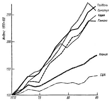 Новые индустриальные страны Азии уже наступают на пятки Соединенным Штатам и Японии. Это - Южная Корея, Тайвань, Гонконг и Сингапур. О новых индустриальных странах (НИС) можно сказать, что они являются "следующими по конкурентоспособности . Пока развитые страны ведут экономические баталии между собой эти четыре резвых "дракона" развили высокие темпы роста (рис. 7) и довольно быстро стали конкурировать голова к голове с развитыми странами.