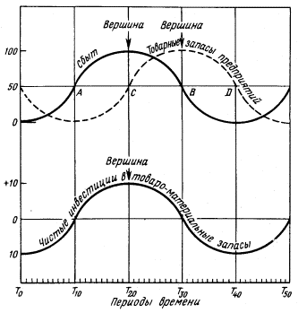 Пусть объем сбыта колеблется, как показано на рис. 72. Поднимаясь до точки перегиба А (и приходя в нее во время T10), объем продаж в каждый последующий промежуток (между Т0 и T10) превышает объем, который продажи имели в непосредственно предшествующий промежуток. Соответственно товароматериальные запасы имеют тенденцию быть исчерпанными как раз в тот момент, когда предприниматели желают увеличить их, чтобы поддержать постоянное соотношение между запасами и объемом продаж. В каждый последующий промежуток вплоть до точки А предприниматели будут планировать свои закупки в размерах, достаточных для того, чтобы, во-первых, восстановить истощившиеся запасы и, во-вторых, чтобы ввиду ожидаемого возрастания объема продаж поднять уровень запасов (до уровня нормального соотношения с продажами). Но в действительности в каждый последующий промежуток (вплоть до точки А) продажи оказываются большими, чем ожидалось [Увеличение сбыта, конечно, ожидается, но только равное тому увеличению, которое было в предыдущий период. Но вплоть до точки А возрастают сами приращения. Поэтому фактический объем продаж в это время всегда превышает ожидаемое увеличение этого объема.. Соответственно товароматериальные запасы продолжают истощаться до момента T10. Товарные запасы предприятий (см. прерывистую линию на рис. 72) будут поэтому падать до Т10, то есть до момента, когда достигается точка перегиба А на кривой сбыта. Как только точка перегиба А пройдена, приращения сбыта становятся меньше и меньше. Соответственно в каждый последующий промежуток между T10 и T20 размеры приращений, то есть возрастания продаж, оказываются меньше, чем те, на которые рассчитывали предприниматели. Ведь согласно нашему допущению предприниматели всегда ожидают, что завтрашнее возрастание продаж будет равно сегодняшнему. Товароматериальные запасы теперь начинают накапливаться, так как закупки предпринимателей основаны на таких ожиданиях в отношении продаж, которые превышают фактический объем сбыта. Это состояние дел будет продолжаться не только до достижения максимума продаж (до T20), но и дальше, до второй точки перегиба В. Ибо на протяжении всего времени T10-T30 в каждый следующий промежуток действительные продажи будут всегда меньше предполагавшихся. После того как максимум продаж достигнут, предприниматель будет, конечно, ожидать уменьшения сбыта, но завтрашнее уменьшение он будет всегда ожидать равным сегодняшнему. В действительности же убывания, начиная с T10 и до T30, становятся все больше и больше, пока не будет достигнута наконец точка перегиба В. И так как действительные продажи с каждым промежутком уменьшаются фактически в большей мере, чем предполагалось, то товарные запасы предприятий продолжают возрастать вплоть до момента T30. Но если сами товароматериальные запасы колеблются, как показано в верхней части рис. 72, то, стало быть, чистое инвестирование в товароматериальные запасы будет колебаться, как показано в ее нижней части. Под "чистыми инвестициями" в товароматериальные запасы понимаются чистые добавления к этим запасам. Но чистые добавления должны продолжать расти, пока на кривой товароматериальных запасов не будет достигнута точка перегиба С. Начиная с этой точки, всякое новое добавление к запасам становится чем дальше, тем меньше, пока в момент T30 не будет достиг