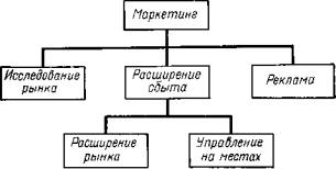 Другими словами, хотя все работы нуждаются в координации, те их виды, которые обслуживают отдельные цели, должны координироваться в первую очередь. На этой основе группировка и разделение могут осуществляться и далее. Так, например, продажа товаров, организация сбыта, реклама и исследование рынка направлены к одной общей цели. Все они способствуют достижению определенного объема продаж или обеспечению для фирмы определенной доли рынка. Необходима их постоянная связь, чтобы обеспечивать правильный «ассортимент сбыта». Следовательно, эти работы могут быть сгруппированы вместе, образуя отдел сбыта. Поскольку общая цель сбыта может быть разделена на подцели, возможно и деление отдела на сектора. Например, организация сети сбыта должна координироваться с подразделением продаж в большей мере, чем с рекламой, т. е. группировка должна быть осуществлена таким образом, как это представлено на рис. 9.