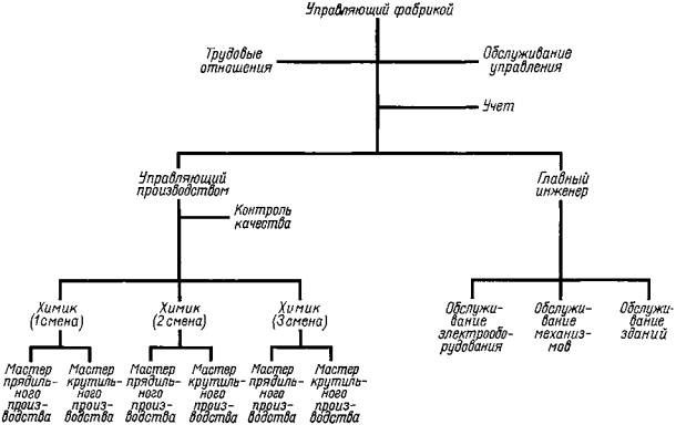 Рис. 11. Первоначальная организационная структура фабрики по производству рейона 1. Решения принимаются не в нужном месте и не на соответствующем уровне. Так, все инженерные службы (главного энергетика, главного механика и эксплуатации зданий) являются общефабричными. Поэтому эти службы должны либо подчиняться общему координатору непосредственно, либо группироваться в сектора, руководители которых подчиняются этому общему координатору. 2. Для достижения координации используются неэффективные методы. В связи с тем, что различные инженерные службы функционируют как общефабричные и их координация необходима в масштабах всей фабрики, сложилась неформальная система координации. Но такая система неэффективна и запутывает иерархию руководства (например, когда главный механик взаимодействует непосредственно с управляющим фабрикой). Это может привести к несогласованности действий руководителей, когда управляющий фабрикой дает распоряжения подчиненным другого руководителя, создавая путаницу. 3. Координация между службами несовершенна: а) разделенными являются функции, объединение которых могло бы дать экономию от роста масштабов деятельности и улучшить руководство в масштабах фабрики. Это, например, функция ремонта оборудования, б) тесно связанные подразделения, работающие под раздельным руководством, для усиления координации можно объединить, например прядильное и крутильное производства; в) структура руководства прядильного и крутильного производств запутанна.- Подчинение сменных химиков управляющему прядильным производством, а сменных мастеров - и сменным химикам, и управляющему крутильным производством оставляет нерешенной проблему координации и может привести к несогласованным действиям. 4. Функциональные работники неправильно расставлены в управленческой иерархии: а) подчинение службы контроля качества управляющему фабрикой предполагает, что функция независима от управляющих прядильным и крутильным производствами и осуществляется от имени управляющего фабрикой. Фактически же это подразделение следит за работой сменных химиков и снабжает управляющих производствами информацией, необходимой для контроля качества работы их подчиненных: б) первоначальное подчинение управленческих служб отделу учета было, несомненно, способом их привязки к авторитетной группе, заинтересованной в их развитии. Однако после укрепления управленческих служб их подчинение отделу учета перестало быть обоснованным с позиций любого критерия группировки. Это общефабричная функция, которая должна контролироваться непосредственно управляющим фабрикой как часть его неделегируемой ответственности за общую эффективность производства.