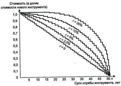 На рис. 6 по оси ординат представлены значения стоимостей инструмента длительного пользования для каждого возраста, на оси абсцисс - его возраст. Общий срок службы инструмента - 50 лет. Линии зависимостей составлены при различных предполагаемых уровнях нормы прибыли (r). Площадь между каждой ступенчатой кривой и осями представляет совокупную стоимость полного набора (или самозамещаемой группы) инструментов всех возрастов. Стоимость такого набора возрастает от n/2 до максимума n, при росте нормы прибыли от нуля до бесконечности. Эта вариация цены стареющего оборудования не может быть объяснена с позиций издержек производства. Она возникает исключительно из необходимости сохранения, при изменении нормы прибыли, равенства цены всех единиц продукта, какими бы ни были различия в возрасте инструментов, посредством которых они соответственно произведены. Хотя интерес к этому типу ценовой вариации проявляется главным образом с позиции теории капитала, ее эффект в случае основного капитала длительного срока службы (например, здания) может быть заметным. Таким образом, в случае строительства нескольких заводов подряд в течение ряда лет, годовые нормы амортизации первых единиц, введенных в эксплуатацию, доступны для финансирования последующих единиц и первые нормы будут тем выше, чем ниже норма прибыли: в результате, при данных издержках строительства завода, общие требуемые чистые инвестиции будут тем больше, чем выше норма прибыли. В примере, показанном на рис. 6, инвестиции пропорциональны площади между соответствующей кривой и осями - площадь, которая возрастает по мере роста нормы прибыли.