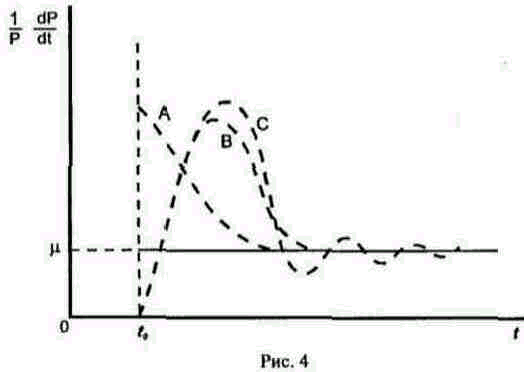 В нашем иллюстративном примере это расстояние соответствует 20% - разнице в номинальных запасах (с 1/10 до 1/12). Встав однажды на этот путь, общество идет по нему и дальше. Пока цены и номинальный доход растут на 10% в год, реальный доход остается постоянным. И так как номинальное количество денег также растет на 10% в год, оно остается в постоянном отношении к доходу - составляет 4 1/3-неделъного дохода от продажи услуг. Чтобы встать на этот путь, необходимы два этапа изменения цен: [1] одноразовый 20-процентный скачок, который обеспечивает снижение реального запаса денег до уровня, соответствующего обесценению каждого доллара из первоначального запаса на 10 центов за год; |2] непрерывный до бесконечности рост цен на 10% в год, который обеспечивает поддержание на этом новом уровне постоянной величины денежного запаса в реальном выражении. Можно кое-что сказать и о переходном процессе. Средний темп роста цен должен превышать 10% и превзойти равновесное значение, которое установится лишь в долгосрочной перспективе. При этом будут наблюдаться колебания. На рис. 4 равновесному значению соответствует сплошная горизонтальная линия, три пунктирные кривые иллюстрируют другие возможности: А - однократный перескок и постепенное возвращение на стационарный уровень, В и С - выход из начального состояния недобора темпа с последующим однократным или многократным переходом через стационарный уровень. Эта необходимость перескока через стационарный уровень темпов роста цен (именно темпов роста, т. с. относительно приростов, а не абсолютных величин этих показателей) является, по моему мнению, ключевым моментом монстаристской теории циклических колебаний. На практике необходимость перескока возникает как следствие начального недобора темпа роста цен (как на кривых В и С рис. 4). Когда вертолет начинает разбрасывать деньги непрерывным дождем, людям требуется время, чтобы приспособиться к происходящему. И вначале они позволяют фактическому запасу денег превзойти желаемую в долгосрочном плане величину.
